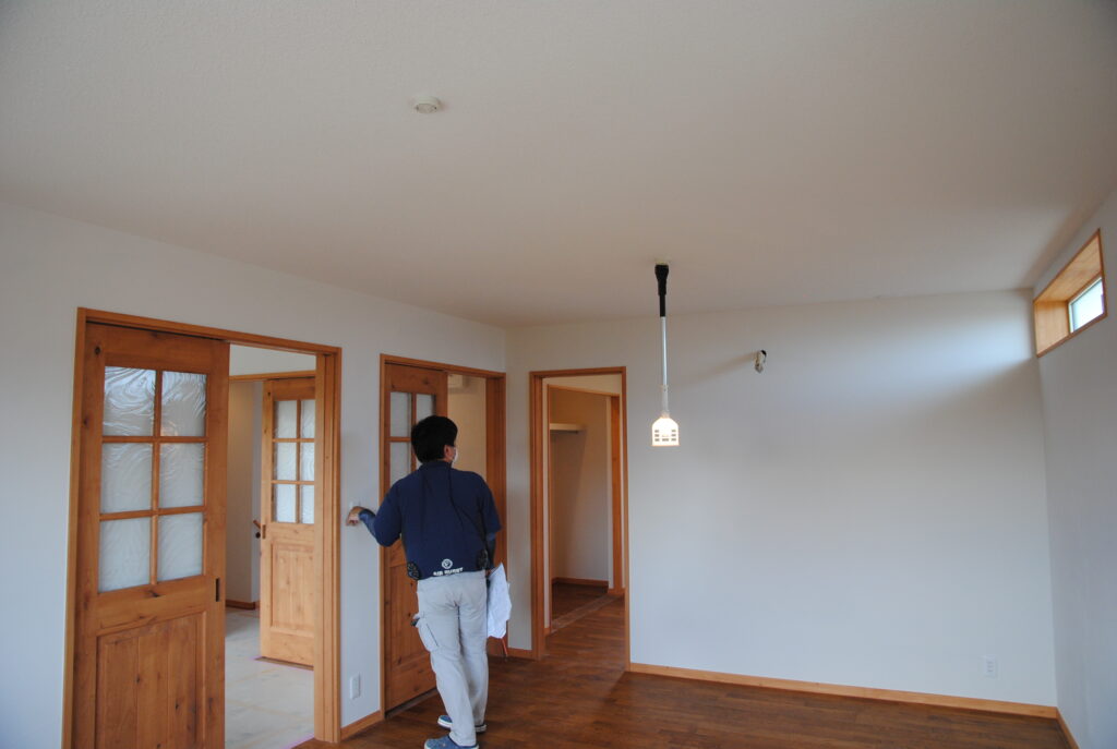 各部屋では、スイッチと照明が連動するかの確認。生活であたりまえなことが、あたりまえに動かないといけないため、完成前にじっくり時間が取れることも重要です。