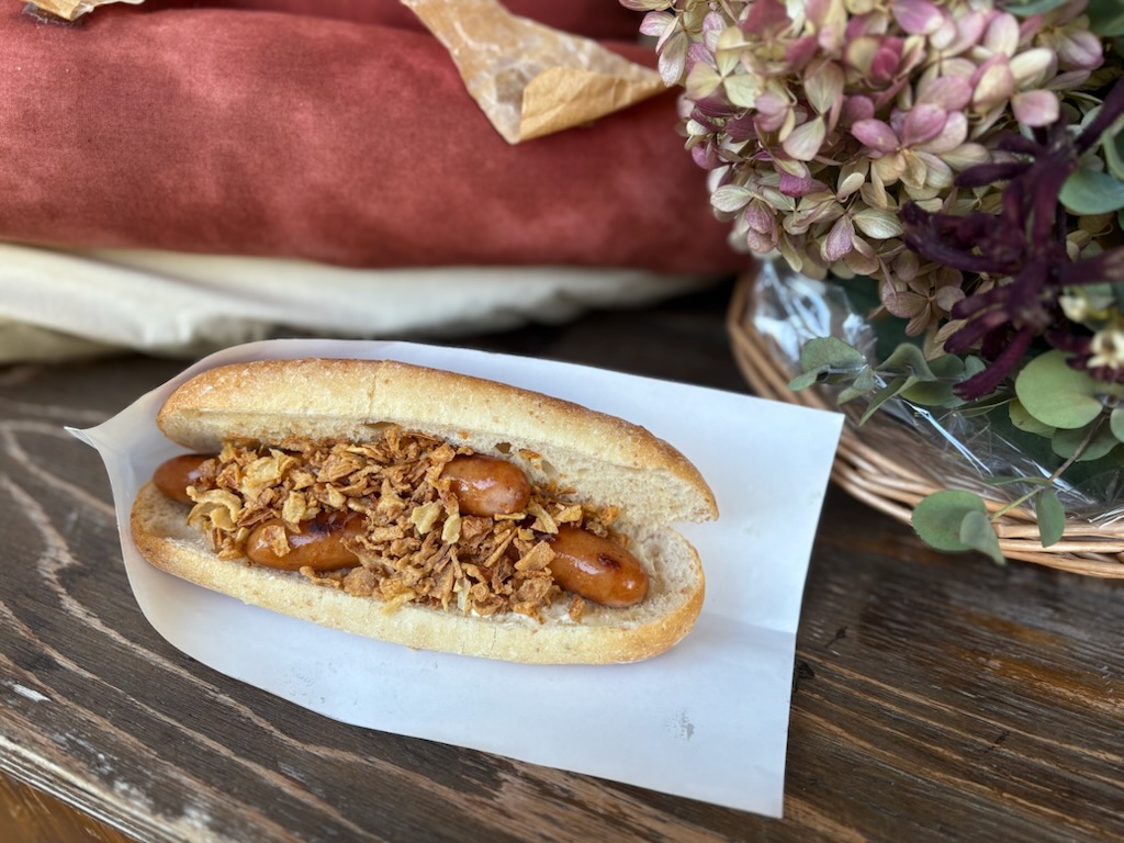 〈森のカフェ〉で出来立て熱々のホットドッグをいただき