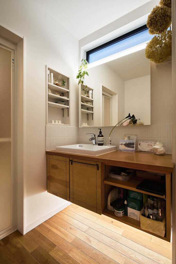 写真のサニタリーでは、鏡の後ろに取り付けた照明が上方を、洗面キャビネットの奥に取り付けた照明が足元を照らしています。壁、天井、床に反射させ、室内全体を明るくしています。