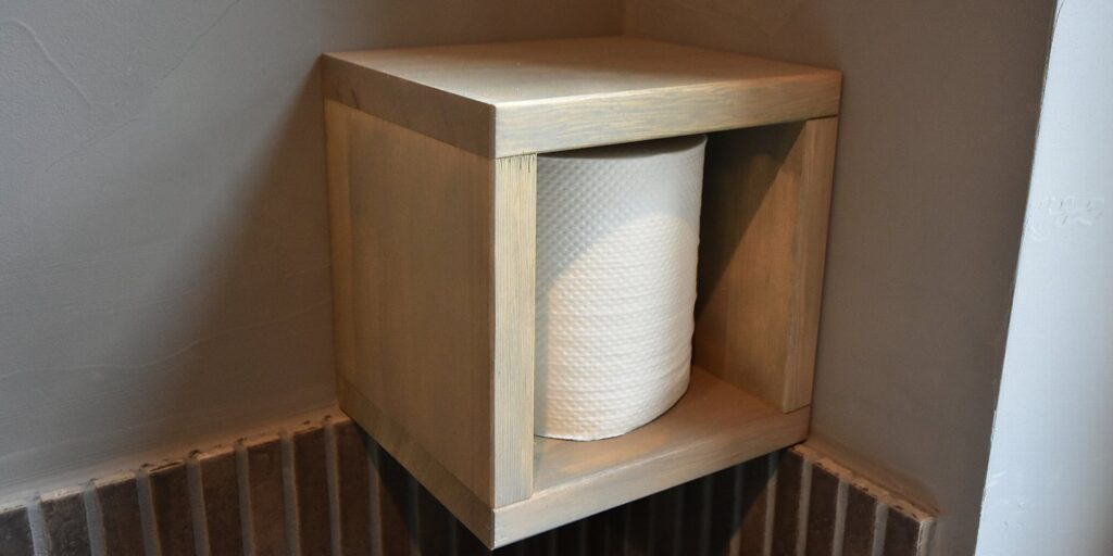 上の写真のように、正立方体の収納をつくると、立てても、あるいは輪が見える向きに寝かしても、トイレットペーパーはおけます。