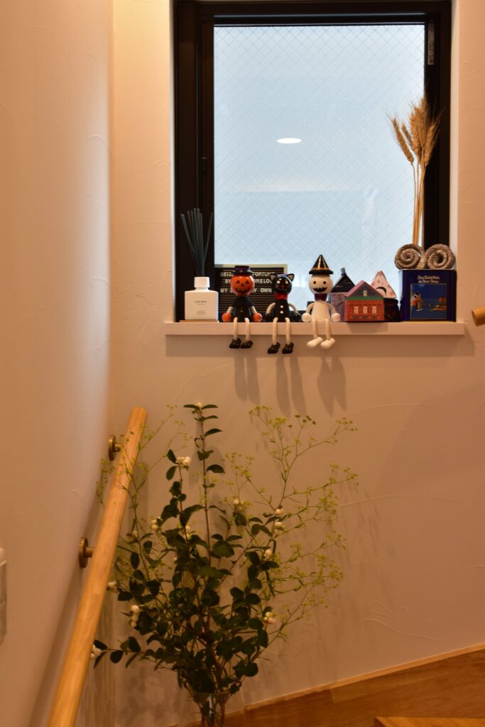 また、階段ホールにおいて、もともと近隣が近く、曇りガラスを使った場合は、カーテンやロールスクリーンなどもつけないケースがあります。その場合は、窓枠そのものをニッチのように考え、ディスプレイする場として活用できます。